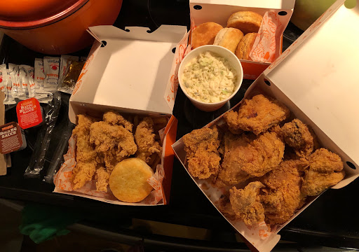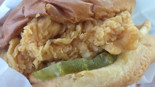 The food is always very fresh. The chicken is always crispy. I think its a little bit spendy for when I get. Its kind of hard to get into if youre coming from the West but not that hard to get out of if you need to go west. Theres a stop light at the corner which as a good job of regulating traffic and making it safe too exit the store.