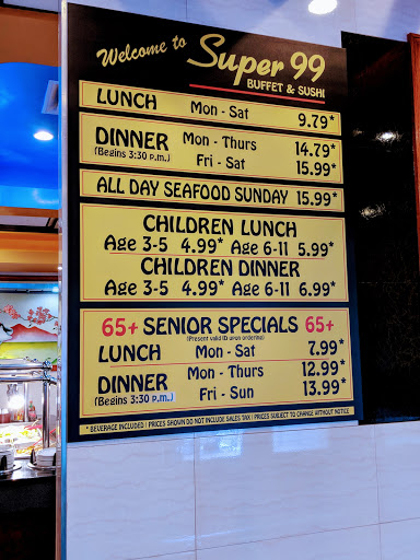 I was excited to try Super 99 Buffet, since I had never eaten there before. First of all the "hostess" was not friendly or welcoming at all. The food was not good, marginal to say the least. I was there during a weekday night. The price was outlandish for a weeknight!