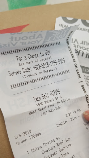 I pretty much expect my order to get fd up when I go here (I continue because my wife loves Taco Bell). Last experience: This Taco Bell has hit bottom. Ive gotten accustomed with my orders missing toppings, heck I even expect it now. But this last visit was the worst! Not only for Taco Bell but probably the worst visit to any restaurant Ive ever been to! Spicy Tostada (had chipotle sauce, and corn tortilla was *very* stale*, couldnt eat this) -no chipotle sauce Queasalupa Beef (no cheese in tortilla, "you had me at cheese", more like "ive been had", 1st and last time to try it) 7 Layer Burrito (mostly beans which were dry and very dark, probably several days old) - no latin rice Cantina Power Burrito (*DISGUSTING* & inedible, mostly mayonnaise & limp, soggy, lettuce, a little cheese & chicken, no black beans, no guacamole, no pico de gallo, very disappointed since it was $4 & I was really looking forward to trying it) Receipt barely readable, thats why I gave no Survey Code. Now your website is telling me 3 minutes left or I have to start over... Im only at 37% finished!!!