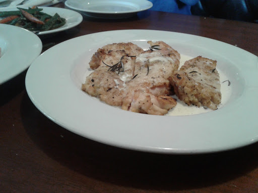 Not going back to this place. To start my boyfriend and I had planned to drive around town and find a cute place to eat for dinner. This restaurant looked nice so we went in and were seated right away. Our server came to get our drink orders and took a while to get back on food. The menu was small and there were only about 4 vegetarian options so I ordered a salmon sandwich and we also added side ceasar salads. Before the salads we were given bread... 2 weany slices with butter (ok lame, seriously?) and were never offered more bread (cheap #1) then we got our salds and it had pretty much no dressing so we had to actually ASK for more (cheap #2) then the band started (annoying #1) we had NO idea there was a band and it was SO loud, if we had known were wouldnt be able to hear ourselves think, we would have just left. The entire time the waitress was good about refilling drinks but everytime I asked her something extra she was like "WHAT?" (this started before the band even, annoying #2) we get out food and to my irritated surprise there is BACON on my sandwich (annoying #3) who puts bacon on a fish sandwich??????!!!!!! I told the waitress I had no idea (not on the menu description) and it needed to be remade. She was like "ok" then came back a few min later and was like "yea its gonna be a while" like its my fault... my food actually came back out only about a min after but I was suspicious (since I only waited 5 min) they just pulled the bacon off, ew. so we pretty much left right after that. Overall not a good experience and the food was overpriced anyhow so I wouldnt even consider trying again!