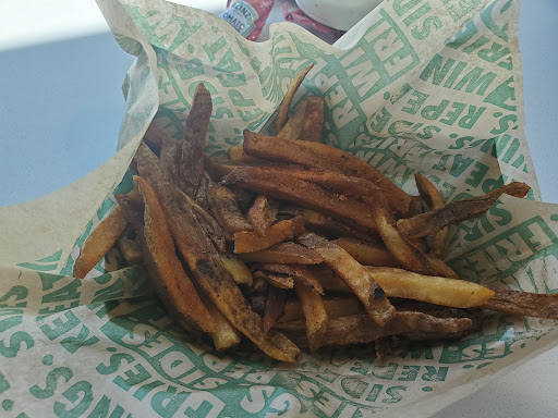 On my one and only visit - had regular wings with cajun and original hot sauce. Cajun was good and tasty. Original hot was the traditional orange hot sauce and nothing too special. The "seasoned fries" were heavy on the salt, but still tasty. Service - I asked the woman at the register to change from a national game to a local sports game on the tv after completing my order. She did not change the channel. 15 minutes later when my food was ready I asked someone else and they complied. The reason for me eating at their restaurant was to watch the game during my lunch break. I missed 15 minutes of the game. After eating my wings, I went to wash my hands (because they did not provide wet naps). During my visit to the restroom, they threw away my drink. At this point, I sat and watched the remainder of the half and left disappointed. The service really detracted from my experience.