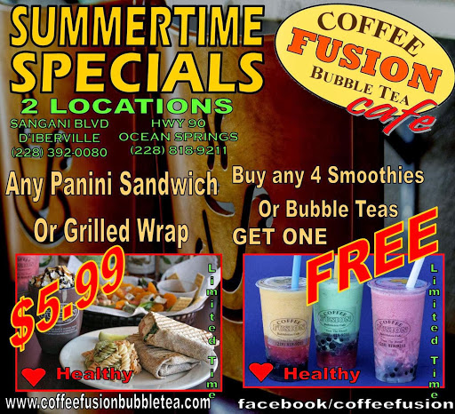 coffee fusion is by far the best coffee/bubble tea shop i have ever been in. and not only that there food is amazing to. plus there is always a clean table. coffee fusion is a really great place to have meetings get lunch on the go or just hang out with your friend. i would recomend anyone to coffee fusion!!!!!