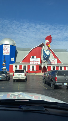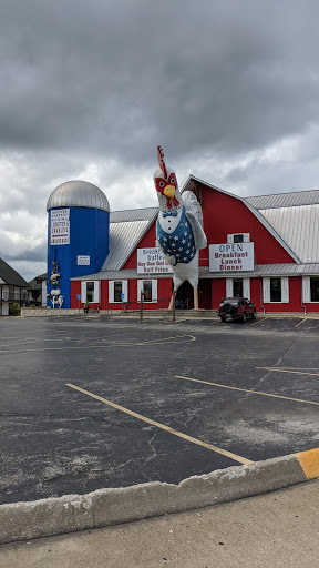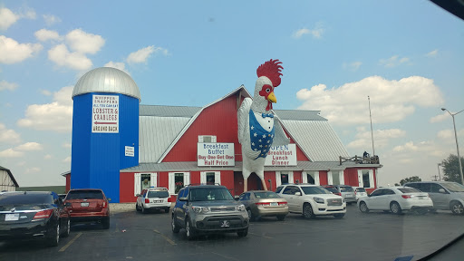 One word: MERCHANDISING! Great American Steak & Chicken the shot glass, Great American Steak and Chicken the cowbell, Great American Steak and Chicken the t-shirt, Great American Steak and Chicken the water pistol. I felt like Id walked into a high-octane infomercial. Its capitalism on steroids. Clearly the owners are more concerned with reaming aged tourists and ruining their intestinal lining than with providing a quality dining experience. We got the breakfast buffet. The food was tired, greasy, and begged me to put it out of its misery. The waitress was the same. This meal was not worth the twenty dollars... not worth the giant chicken... the visit was, however, an educational experience. Went downstairs to use the restroom where I had to navigate through several more layers of weird restaurant gift shop. Disturbed by the smell, I looked around and found the seafood buffet just a-sittin under the heat lamps, waiting for the clock to change. If they shut down the restaurant portion, they might have a nice souvenir store. As it is... Im not sure whats going on there. Worth staring at, but not worth the health repercussions. My boyfriend and I both felt nauseous after eating here.