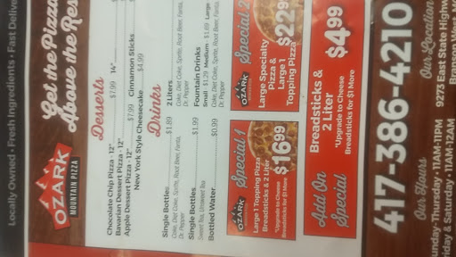 While vacationing in Branson we dicided we wanted pizza. First time we had Ozarks, they delivered to our hotel within the time they said it would take and it was still hot. Staff was friendly on the phone and at the door. Would definitely recommend!