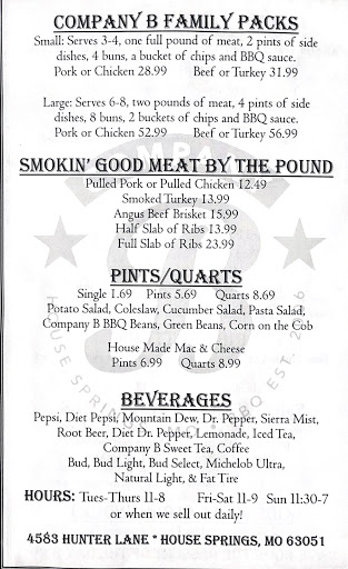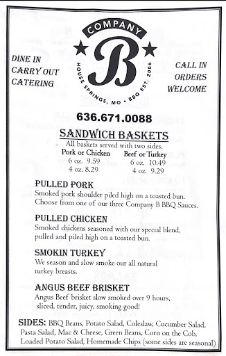 I like to stop by here from time to time and order a pound of pork and a pound of their bbq chicken. I take them home and we use them as a base for our dinners all week. The prices are so good, we cant make their bbq this good at this price on our own! I love Company B.