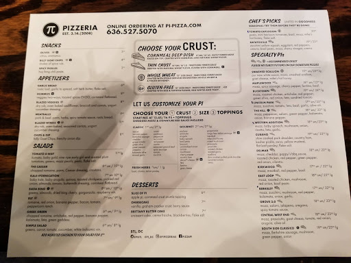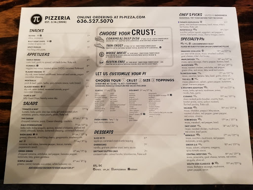 Being from New York, finding good pizza in St Louis can be a challenge. Pi delivers (pun intended). While they lack a thick crust, typical of a good New York pie, they use fresh ingredients and can cook them to order. We ordered a large thin crust pie with marinara sauce and mozzarella, topped with mushrooms and pepperoni and cooked well done. Took off one star for a slightly small pie and no crust compared to what Im used to, but the remaining stars are there for the taste!