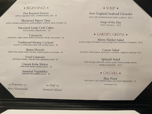 The menu is small and overpriced. The food was good, but not worth what we spent. The service and atmosphere were also good, but overall this is an unremarkable restaurant and I am in no hurry to go back. One would be better off going for happy hour than anything else.