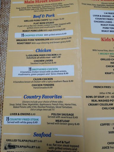 Homey atomsphere, good service, good food. Depending in the day if the week that you go to Main street Cafe will depend on whether there is a wait to be seated. The Cafe is closed in Mondays.