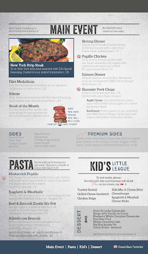My husband and I love Grand Slam Sports Bar!! My favorite is the steak sandwich. Always cooked to perfection and delivered by some of the friendliest waiters!! My husband likes their prime rib. Actually, weve NEVER received anything bad there!!!! You have to try the Grand Slam Sports Bar!!!