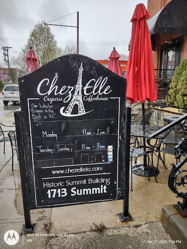 An Amazing Kansas City Creperie This morning, we ate brunch at Chez Elle Creperie Coffeehouse. Not only was it amazing, but it was also located in the up and coming Westside neighborhood at 17th and Summit. Chez Elle is located in the renovated Summit Theater building, location of the first movie theater in Kansas City that showed movies with sound. I highly recommend the Bonjour crepe filled with bacon and cheese, and topped with scrambled eggs. Chez Elle has wonderful French decor, an interesting history, an urban neighborhood, wonderful food and “coffee that just makes me happy!”