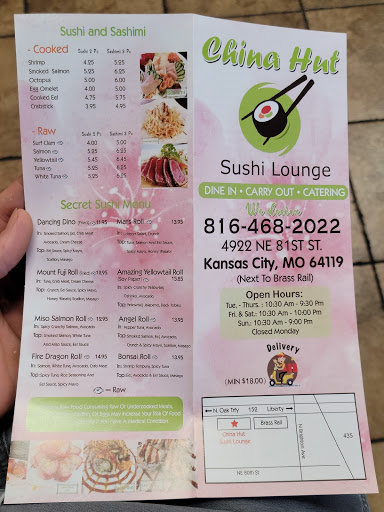 Great place to get sushi and Chinese food in general. We live right down the street and this is our go to carry out place. China Huts sushi menu is unique too. They have the typical rolls but the rolls on their secret menu (not very secret) are all pretty unique which is great for trying new things. They have good soup and crab Rangoon as well. Ive only ever gotten the Dragon and Phoenix from the entree side of the menu but its been great every time.