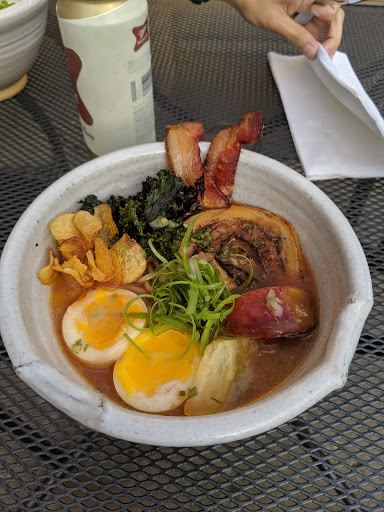 Loud and hipster if I had two words to describe the atmosphere. Small inside with just two tables and maybe 10 seats at the bar. A few more tables and bar seating outside. The tonkotsu was great. Noodles were chewy and bouncy though not particularly alkaline. Broth was amazing. Chashu seemed fatty to me. Also cant believe they charge two dollars for a soft boiled marinated egg.