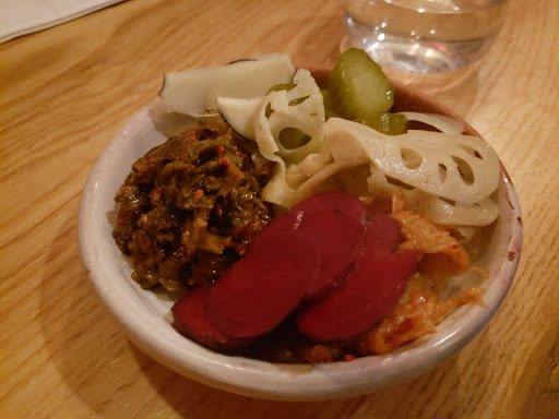 What a great meal! We had the seasonal pickle plate which had, pickles, mushrooms, kimchi and one more thing I cant remember. My hubby had the Shoyo and I got the mushroom ramen. Both were very tasty and very different in flavor. The service was great and the food came out quick. We are planning on going back soon!!