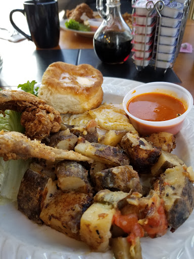 How did it take me this long to go here?! We went for breakfast and were thoroughly impressed with the food and the people working there. Really nice people and these guys know how to cook! We often complain that Waldo doesnt have any diners, just brunch places. Now we have a go-to place for breakfast. :) Eggs cooked perfectly, great pancake with crispy edges, perfect biscuits, sausage gravy is peppery and tasty and what is a classic breakfast without a chicken wing on the side? :D They are pretty close to a Peanut wing (this is high praise! - whole wing breaded, fried, then dipped) and you can get buffalo, bbq or no sauce. Their buffalo sauce is what I had and it is fantastic. Nice and tangy, good amount of heat. My eggs always get a healthy dump of hot sauce, so a nice messy chicken wing is great on a breakfast plate in my opinion. They will also let you sub bacon for the wing if that isnt your cup of tea. :) They also do chicken and waffles, which is what Ill get next time we go, which I hope is soon. :) We have seen about four different owners/restaurants in this building over the years and this one is cranking out by far the best food. Lets make sure they stay around!!!!