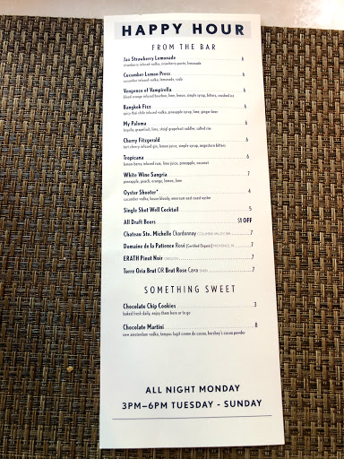 I finally got the chance to experience Jax on a Tuesday for happy hour and I wasnt disappointed. My friend, her seven week old son and I stayed there for about 2.5 hours enjoying a ton of things off the happy hour and special tasting menu they created in partnership with Cinder Block Brewery. We arrived right at 4pm when they opened for dinner with reservations. Good thing too, 30 minutes later the tables were all gone. I started with a 1/2 dozen of the happy hour oysters. They were small but sweet and briny with a great texture. We also had the spicy tuna (2 orders actually), wedge salad, chorizo mussels, burrata, fruit de mer, and cider pork belly spring roll. All of the dishes were very tasty and a bit on the small side but fine for happy hour and sharing with the prices ranging around $6-8 per order and $13 for the pork belly on the special menu but that also came with a drink pairing. A few interesting things to note, the place was packed by 5pm so make a reservation if you can or battle it out with Plaza workers for a spot at the bar. The happy hour crowd was very interesting, a lot of pretty people and some 60/30 action going on. We saw several older gentlemen experience a wide range of success/failure with young women in tight dresses. Also of note, the bathrooms do not have trash cans, neither the mens or womens. They have cloth towels which is a great green choice, but if a kid has a diaper incident like we did theres nowhere to put them. Maybe its a deliberate design to keep babies out or merely an oversight. Just FYI.