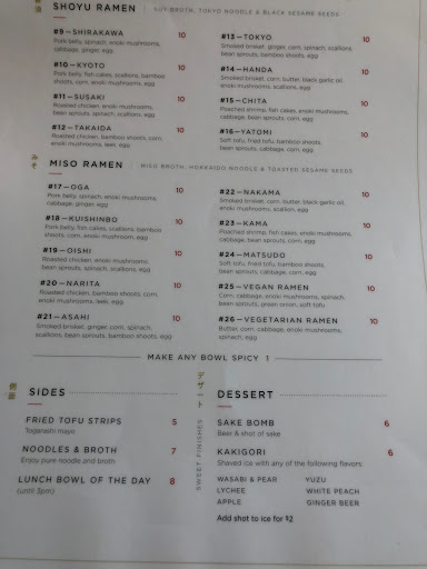 A solid midtown ramen option, but still going through growing pains, it would seem. The food is quite good, but be prepared to check your order for accuracy, or be told by staff "I dont know, Ive never done that/made that/ordered that before" which can be unsettling. The decor and sheer size really make the place feel less like a ramen spot and more like a ramen department store (?) so Ive opted for the usually lively bar area, which is cozier option (dim the lights please, though) - the only downside to the bar is the service is spotty. I highly recommend the #1 and #2, with the added spice option served on the side. The pork broth is fantastic, as is the pork itself. The Hakata Noodle is well made, cooked perfectly, and the right size for slurping. Fair warning: the shaved ice dessert served here is nothing like the shaved ice in Japan (in case you were hoping for that). Its simply a snow-cone like dessert option, and definitely not worth the money - just head over to Miami Ice if you want a better option. I look forward to this spot continuing to improve and coming here through the winter for my ramen fix!