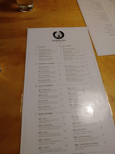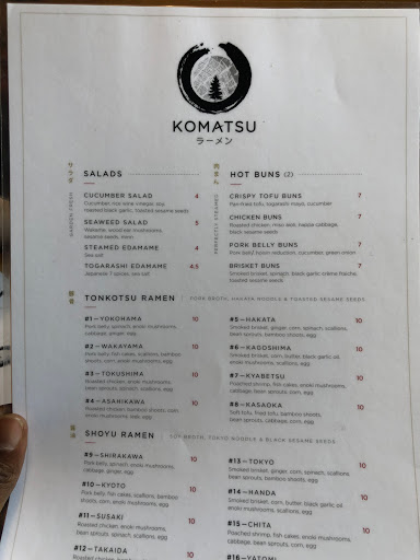 Komatsu! This place is a pleasant surprise. When you walk in the door, its hard to tell at first that it is going to be phenomenal food. The decor consists of plywood, plywood, and more plywood that has been put together to make booths and stools. This doesnt stop them from making out of this world ramen though. My husband had a beer while I tried the Pinappuru-hai cocktail. Both were a let down, really not worth the cost, $8 for the cocktail, $10 for the beer. We started with the Togarashi Edamame, which is just edamame with some 5 spice on top. Nothing too exciting there, but well cooked. We also had the Pork Belly Buns, comes with 3. These were pretty good too, exactly what youd expect reading the menu. The Ramen is where we were blown away. I had the #1 Yokohama ramen with pork broth. Although there could have been a little bit more pork, it was a great portion size and was delicious. My husband had the #6, also in the pork broth, spicy. We both thought they were fantastic. One bonus is that you can "make it spicy" for an extra 1$. My husband chose to do this from the beginning and I added the spice on the side. Both are excellent choices. The Spicy addition is very flavorful without adding too much heat. Overall we would definitely go back. Outside of the only average cocktail and appetizer, wed highly recommend this place for the ramen.