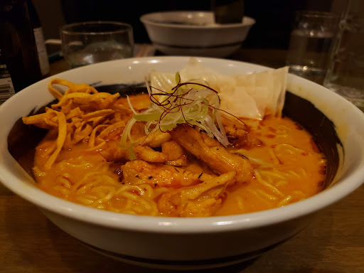 Right when we were walking in it felt a little reminiscent of small ramen joints in Japan alleyways. The server was inviting and knowledgeable on the menu and his suggestions. I ordered the ( Khao Soi-men ) a lightly flavored coconut curry broth chicken noodle. Light as in not very strong in flavor and the noodles lacked much of anything. I can say the same for my mates other choices. Their noodles didnt have the flavor Id expected, though the broth was good and the portions on point. It falls short at the flavor factor. We also enjoyed some Saké, it was the cloudy (Hautsuru Sayuri) and it was delicious. Id come here for dinner or at an off time so you can avoid crowds. Its 6:30pm and its starting to get a little stuffy for this little noodle spot in KCMO.