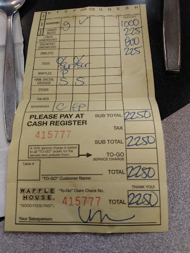 Fast, friendly service. One of the better looking Waffle Houses Ive seen. I would definitely eat at this location again.