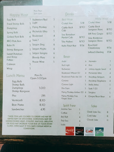 Absolutely the BEST Pho Ive ever had!!! Ordered the Combination Pho, BBQ Pork Buns (which were Outstanding, as well) and the Spring Rolls (could have used more shrimp but still good and fresh). I had more than enough food to not only eat for dinner but for lunch the next day, too. The price was very reasonable - I went at 4pm so Happy Hour prices applied. The time I walked in, ordered, received my carry-out food and walked back out was less than 15 Minutes!! Im just so pleased with them. Ill definitely be back and telling everyone to go in the meantime!!