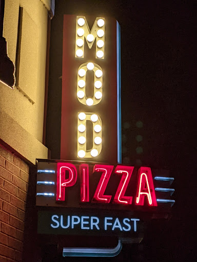 "Will they have Coke? Will they have Coke?" Thats what I always wonder when I go to a new place. Im a total Coke addict. Coca-Cola, of course. As I walked up to the building, I snuck a peak inside and saw a soda fountain with a big red logo on it. Hooray! A Coke place. If it had been Pepsi, I was going back to my car. Im not really sure why these fast-casual pizza places (e.g., Pie Five, Pieology) are popping up everywhere. Remember when yogurt places were trendy? Now its pizza--fast, personal pizzas. MOD is a little different. You can get a personal pizza that is about the same size as the one you get at those other places, but they also have mini pizzas and larger pizzas. Everything else is pretty much the same. You choose one of their pizzas, or create your own. Its made in front of you, and you can have as many different toppings as you want without an increase in the price. I had the Dillon James (mozzarella, asiago, basil, garlic, sliced tomatoes, and marinara). I could have used more sauce on my pizza. I was tempted to ask for extra sauce when it was being made, but having never been there, I thought Id try it as-is at least once. Ive been to Pie Five and Pieology, and I thought MOD had the best crust. I also thought they were the most organized. I would appreciate a nutrition calculator on their website, but that is not the fault of this location. Im deducting one star because my pizza tasted slightly of cinnamon sugar. In addition to pizzas and salads, they also have garlic and cinnamon strips. I think my pizza was cut after someone cut some cinnamon strips. It was kind of weird--and kind of delightful.