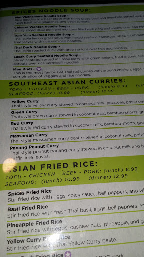 Spices in at the same location where a failed Mexican place once resided, and still has a little of the latino decor left over, but the food is straight Thai with a little Chinese thrown in. Its family-run and they aim to please. I walked in and was immediately seated. The menu has lots of traditional Thai favorites, so I ordered chicken panang peanut curry - one of my favorites. After ordering, I learned the noodles at Spices are made by scratch, so next time, Im going to order a noodle dish. My food came out in 5 minutes and was served with Thai hot relish pepper accompaniments that I dont recall seeing at other Thai places in KC. Nice clean bathrooms. Plenty of parking. Take-out ordering. Perfect portions. I was very pleased with the spicy yet balanced flavors. It was also fun sitting at the bar and watching the staff operate the modern, fancy restaurant POS. Cannot wait to go back.