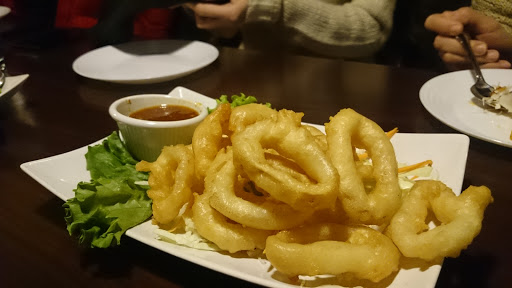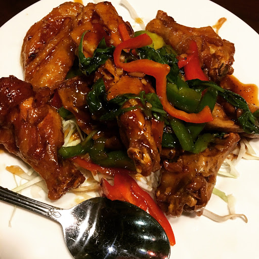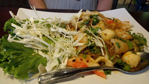 Spices is a great little find. Its a bit of a fusion/pan Asian restaurant offering a few Chinese dishes, pho but mostly focused on Thai cuisine. The online menu features a lot of dishes but the restaurant menu had a few dishes crossed out so keep that in mind if youre browsing for dinner online. We wanted to start with the calamari but the friendly owner suggested we try her fried shrimp rolls and we were not disappointed. The rolls were like little cones stuffed to the bottom with whole shrimp and a fish paste. They were perfectly fried and came with a sweet and sour dipping sauce that was wonderfully balanced. I had shrimp pad see ew which was full of shrimp and vegetables with the right amount of sauce. I got it medium spicy but couldve gone one level up since I love some heat. My friend had the yum yum spicy seafood salad which came with a nice mix of seafood including shrimp, squid and fish balls. The décor is modern, clean and welcoming and the staff is friendly and attentive. Im planning on going back already because I cant stop thinking about those shrimp rolls.