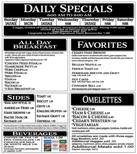 Excellent home style cooking , food is always superb ,great atmosphere , good prices and great service. We have made this one of our regular places of dining . Thank you to all at Cedars!