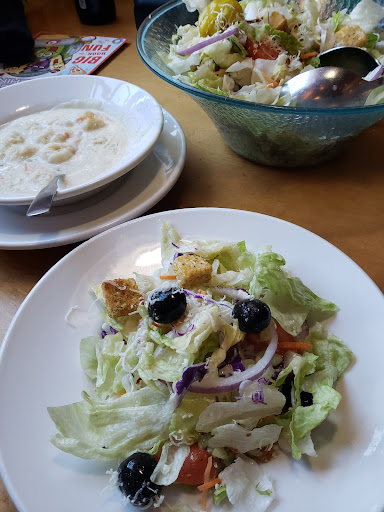 Worst service ever. I came on a Tuesday at 5:45 and was a party of one. Was seated immediately in a section with 3 other occupied tables. It was 5mins before they took my drink order and another 5mins to order my meal because the waiter "was swamped". 10 mins later my salad arrived. I had plenty of time to finish my salad, bread sticks, and iced tea in the 15 mins it took to get my meal. The waiter kindly told me he would get me a refill, and some more bread stick (neither ever happened). When the server finally brought my meal she dropped the handle of the cheese grater on my plate and spilled cheese all over the table to which prompted may waiter to say " I dont think it touched your food. Ill clean that up and bring you some more tea.) He did bring the tea, but didnt clean up the mess until he brought the check. when you come to this location there are some local terms you need to know. Swamped = 3 other tables. Tuesday = busiest night of the week. Large group = 1 person. Refills = 1 per visit Unlimited = what you get the first time. Ill clean that up = sometime before the next customer sits down. Save yourself the hassle, there is a Wendys across the street.