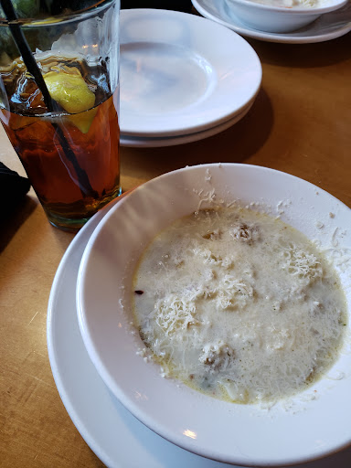 Service 3/5, Atmosphere 1/5, Food 2/5. Our party of 3 ordered Zuppa Toscana with our dinner entrees, which arrived mostly broth with no Kale and tiny bits of potato & sausage. Our waitress brought us new bowls with more substance; We likely wouldve asked for a different soup if shed offered. The steak in the "Steak Gorgonzola Alfredo" had a bizarre, almost ammonia-like taste - The "Stuffed Chicken Marsala" was a very small portion for the $18 price, and was not "stuffed" at all, but cooked with all of the cheese over the top. The mashed potatoes and breadsticks were probably the best part of the meal. All of the booth seating and small tables make this Olive Garden feel more like a Dennys or Perkins, and much less like other Olive Gardens Ive visited in the past. Overall, I cant say the experience warrants a return or recommendation.