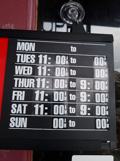 | Working: | Closed 11AM–9PM 11AM–9PM 11AM–9PM 11AM–9PM 11AM–9PM Closed |