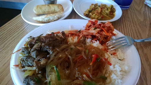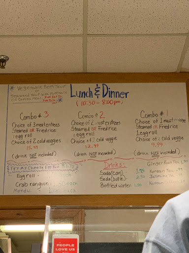 Not much atmosphere, small dining area, but the food is great. Take out is available. If you are in a hurry try a combo meal with your choice of up to three Korean BBQ meats, rice, noodles, potatoes and your choice of two additional side dishes (kimchi, vinegar vegetables salad, ginger slivered potatoes, squid, etc.). If you are not in a rush, consider the Bibimbap which is freshly prepared and served in a lava hot bowl. All meals include a quality made from scratch egg roll and a crab Rangoon.