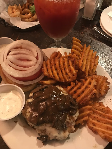 I was brought here by some friends who live in Alma and Oh-my-gawsh... so good. I started with a Bloody Mary and we shared a large order of onion rings. I see why people talk about there. I had the mushroom Swiss burger with tomatoes and extra onions, I like onions, with waffle fries with house made ranch. The burger was excellent but a little over cooked as I ordered it medium but the gravy on the mushrooms made up for that and it was excellent. We were there late Saturday night and it was quiet and dim, perfect for visiting with friends. Overall I had a great experience and will definitely be back. Oh and get the onion rings, youll be sad if you dont.