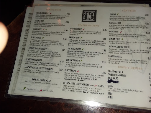 One of the best burger joint in Omaha hands down.this place gets packed around noon with a line out the door so I usually try to go around 1:30 when the crowds arent as bad what initially drew me to block 16 was their duck duck goose fries.its fries with bits of duck and crispy duck skin with gooseberry sauce and cheese on top I get it every time I go.they also do poultine and about three other french fry dishes along with sandwich of the day and grilled cheese of the day usually a cheese you have never heard of but is probably delicious served on some amazing sounding bread.they also serve locally brewed beers and possibly wine will have to look again next time I go