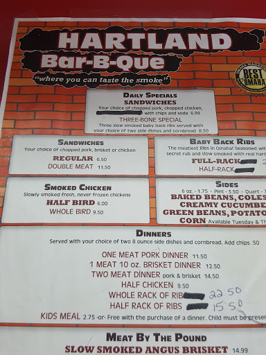 First thing, I am comparing to Swine Dining in Bellevue because the prices are similar and its my favorite local BBQ location. The pork seemed a bit fattier at Hartland, but still tasted good, and their sauces are good. The potato salad was also pretty good. The cornbread, while tasty, was more corn cake than bread. Wasnt ready for that. But why so few stars? Everyone on here seems to love Hartlands brisket, but I guess I wasnt allowed to try it the day we went. I ordered a brisket sandwich and a pulled pork sandwich. She called on the cook for 2 pork sandwiches. I corected her and she yelled to him to change it to a brisket and a pork. We STILL got 2 pork sandwiches. I didnt feel like talking to these people any more, as they apparently cant get my order right when I say it twice. So I went with it, ate my pork sandwich and decided I just will make the drive to Bellevue for better food, an amazingly friendly family atmosphere, and in 5 years, Ive NEVER gotten a wrong order there, nor have I had to repeat my order(and still get it wrong...).