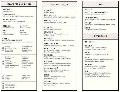 Went around town looking for a new pizza place to try and came across Lighthouse. The staff was friendly and helpful. The pizza was so delicious. You can create your own slice or go for some specialities, and by slice I mean a really big slice. (Fyi, the pizza is thin, but loaded with toppings) The fries were great too; we tried the garlic parmesan and they were flavorful. All in all, I think we found our new pizza spot. Cant wait to take friends and family when they visit!