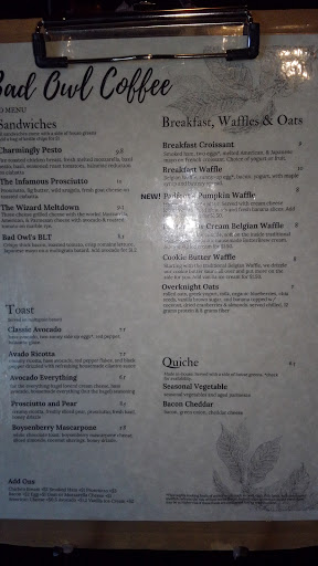 I absolutely LOVE this coffee shop! Ever since I moved to Henderson I have been looking for *my* coffee shop. I had one back home in Utah but until recently havent been able to find one here and Ive tried a LOT of them. A coffee shop to me should be a comfortable place where you can sit for as long as you want and read or bring a laptop and work (Im a published author), it should also - of course - have AMAZINGLY good coffee and yummy snacks. Bad Owl IS MY PLACE! When I first walked in it was packed with a line out the door. Not surprising in Vegas (seems to be a theme for all of the coffee shops here) but also not a bad sign either, right? Two squishy chairs that are never available but I dont care because the rest of the seating ISNT awful. I especially love the long picnic style table for working on a laptop. Why? Because it actually had a raised section down the center of the table so you can sit across from a total stranger and still feel like youre in your own space - you dont have to worry about your screen bumping theirs and whether or not thats going to make them mad (hey, some people are weird like that). You can put your coffee on the divider if you want which gets it out of your way but makes it convenient to grab (just pay attention when grabbing/setting it down so you dont dump it on your and or someone elses laptop because that would totally suck) and the bench is comfortable despite being a hard slab of wood. Barring that, though, the tables are nice too and they all have cute sayings on them that have something to do with Harry Potter. Fun fact! According to the signage, Bad Owl has been around longer than Harry Potter by a decade or so. In other words, they were either a coffee shop by another name before HP or they realized that a place called "Bad Owl" could use that to their advantage, redecorate a little, and cash in on the fandom. Wise move BO. Wise move indeed! Love the decor. Its cute, quaint, HP feeling but not overly in your face and cheesy. Actually, it feels more like a coffee shop that you would find IN HP than an HP themed coffee shop, which is a good thing. Does that make sense? Other reasons I love this place include the food and coffee! Oh yeah, thats kinda important, right? The food is KILLER! Id love to see them add a cheese danish to the menu but the pear tart is to die for. Stick a fork in me, Im done. They also have chocolatey cakey moussey options and everything is ENORMOUS! Several of their coffee options are HP themed like the Butterbrew Coffee (butterscotch flavored, which I liked despite the fact that I hate butterscotch). My favorite though is the Nutella coffee. I can feed my coffee demon and my chocolate demon at the same time. Now for my absolute favorite thing about this place - the coffee is served at the PERFECT temperature for drinking. I honestly dont know how they do it. EVERYWHERE I go including the major international chain that will remain nameless serves coffee at boiling temperatures so you have to wait twenty minutes (60 if you leave the lid on) before you can drink it without burning your face off. I never order hot coffee anywhere because its always too hot to drink. When I get coffee Im ready to inhale it by the time the barista hands it to me - I dont want to sit and stare at it for a half hour like a well trained dog with a biscuit balanced on its nose. I wanna drink it darnit! At Bad Owl I actually can! Its never too cool, never too hot ... I swear they must be using magic to make that happen. Also of note, some of the employees have pretty fun personalities and really get into the spirit of where they work. Its a good time!