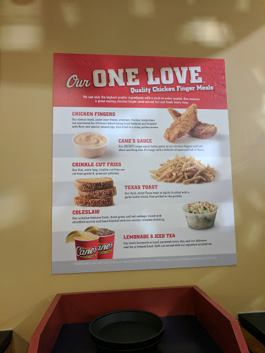 I eat here pretty often with my boyfriend. We absolutely love Canes. Their canes sauce is amazing and the chicken is never dry. We always substitute the cole slaw for an extra slice of toast and we make our own sandwiches. Just pour canes sauce on to the white sides of the toast. Put a layer of French fries on one side and then a piece of chicken on top then you finish it off with the other slice of toast on top. Its absolutely amazing. And then you still have more chicken and fries to eat! The portions are also really big. I can never even finish a box combo. Ten out of ten, would recommend!