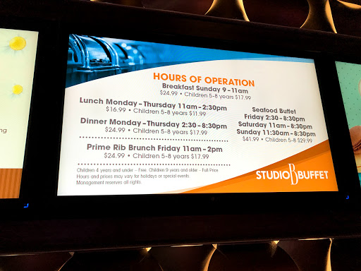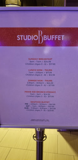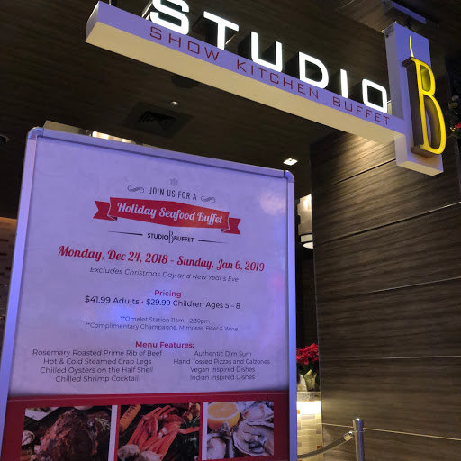 This is my favorite buffet in Las Vegas! The food is absolutely delicious! The only thing that keeps me coming back. Now for the negatives...The service was OK. But I dont blame the staff. They do the best they can under the circumstances. Which are the GAWD-AWEFUL trashy, lousy, rude, nasty and drunken customers. JESUS TOUCH ME! Was Olive Garden closed or something? Screaming kids everywhere, throwing food, trashy looking girls who look like they just strolled off off of Main Street and Vegas Drive after working it for quarters. Or the group of over cologned, orange tan, gold chained guys with their 75 year old wives who look like Charo off a LOVE BOAT episode. The table next to us was a family of four...2 screaming brats, mother and father. Both (the parents) DRUNK as sailors (I counted 16 wine glasses on the table) the father was so drunk he couldnt hold his eyes open and mom was staggering back and forth to the wine bar. We over heard them say to one kid, "Wait til we get home. You can play in the back yard when we get home." OMG!! REALLY? They were apparently local and were going to DRIVE home in THAT condition??!! Lord help those kids! And lets not forget about Cho Cho San Mei Ling, who stepped over the rope with several of her fresh-off-the-boat-- looking like leftovers from a bad summer stock performance of THE KING AND I family...cutting in front of 60 or 70 people in line to pay. Ching Chang Chung jumps right up to the cashier when it was my husbands and my turn at the cash register!! Aaawww HELL NO!! Both my husband and I went OFF on her and her boat family about cutting in line and not waiting her/there turn. I snatched my earrings off and was ready to rumble until the cashier intervened. Chow Chung Mei Ling walked away back over to the line. WHO THE HELL DO SOME PEOPLE THINK THEY ARE??! Suffice to say, STUDIO B is by far the best buffet in Las Vegas for the food. But the customers/clientele are straight from Garbageville HELL. Classless, nasty PHILISTINES!