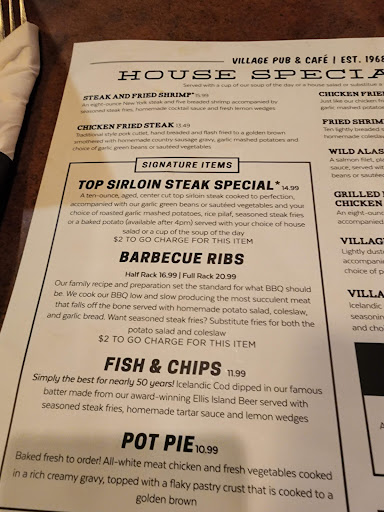 We both enjoyed our lunch.... I had the fish and chips, which they are famous for, the fish was cooked just right, crisp on the outside and tender on the inside, and the tartar sauce is the best. My husband had the chicken fried steak, he too enjoyed his meal. So I rate this experience 5 stars...