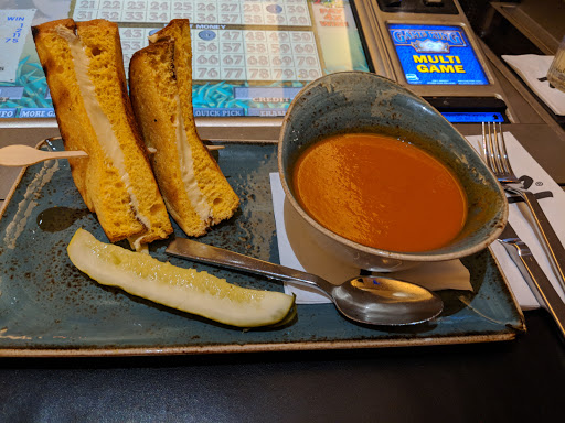 Greaaat food and not expensive, atmosphere is so relaxed. They have a front dining area if you just want to watch the casino and have a few drinks, or they have a back dining area away from the casino with relaxing fire places and again the food surprised me, they have something for everyone from wings to aged steak and lobster, i would go back anytime. :)