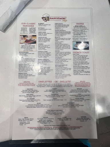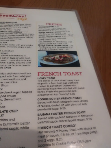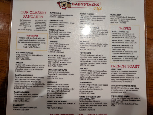 Came off the strip to visit babystacks and was not disappointed! Great diner style coffee too. We ordered short stacks (3 pancakes) each, one in the Tres Leches special and other in Bananas foster. Both had Freddy fresh fruit, whipped cream and delicious cinnamon sugar. We also ordered sausage patties (standard) and Portuguese sausage (the bomb!) saw lots of families ordering eggs/potatoes/meat as breakfast and a short stack on the side, which I think is the way to go if youre really hungry! The eggs and potatoes look delicious. Popped by the bathroom too, very clean, large single. Could accommodate a wheelchair and had a baby changing station. $30 with tip for this great meal. Thanks BabyStacks!