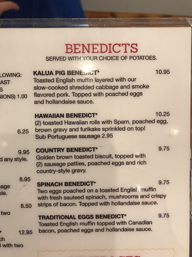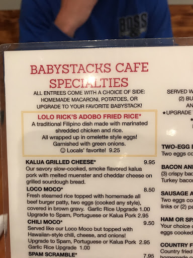 Love this place! Almost didnt come here if it wasnt for our cousins advice. Of course I love to support local and so coming here was a no brainer. Upon coming here we did take notice that they are known for their pancakes and their adobo fried rice. We order those in addition to the Smores pancakes and their breakfast 2 egg special. The 2 egg special wasnt too special I thought. The potatoes as well as the toast look and tasted like something you can get anywhere. The adobo fried rice in the egg wrap lacked a bit of salt but was quite good with a touch of hot sauce. Oh yeah, you know this place is Asian owned because they give you some choices of hot sauce in advance before you get your food. Its tasty but I did wish the fried rice wasnt nearly as soggy. The Smores pancakes are just regular pancakes with marshmallows, choco chips, and regular syrup. It was good but not excellent good. We also got the Kalua Pork benedict. The Kalua pork was juicy, smokey, and so good! I did wish the eggs were hotter and more runnier. I am picky about my benedicts but together, they were still really good. But the best thing we got undoubtedly was the red velvet pancakes. Slightly crisp on the outside with a dollop of cream and the cream cheese syrup on top. The syrup DOES make the pancakes come alive! By the bathroom, it shows how the owner wanted to make cupcake flavors into pancakes. I have to say, she did a wonderful job transforming it. Babystacks are regarded as one of 50 US must try pancake locations. I totally would agree with this statement. They have locations in San Diego and Las Vegas. I thought the service was great overall. I did wish the hostess was friendlier and more outgoing. She seemed like she had a bad day and it was only morning. So great breakfast choice when you dont wan to eat in a casino when coming here to Vegas as a tourist. Just make sure you come early because there will be a wait here!
