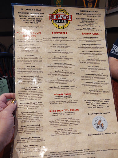This is a great venue to go watch the games if you want to eat! If you want a louder/rowdier time for the games hit the Kopper Keg on Rainbow and Sahara. Great food at the Blvd.