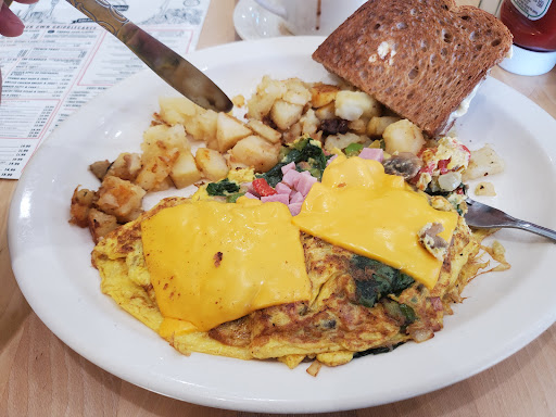 Ive been here twice for breakfast and have gotten the breakfast burrito both times, and it was delicious! Huge portions for the price of $8.99, and it was served with potatoes. The server also refilled my coffee mug frequently. My mom got a spinach, red pepper, tomato, and cheese omelet with potatoes and toast. She loved it! The orange juice my mom ordered was freshly squeezed. YUM!