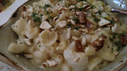 Great bartenders, chatty, friendly, prompt. Ordered grilled octopus, lobster mac and cheese, and whole branzino ceviche. Ceviche was amazing! Great flavors of peppers, olive oil, salsa verde. Grilled octopus was a bit too charred but was still tender, not over cooked. Mac and cheese was ok. Nice flavors, a bit rich. Pasta a bit under done. Cocktails were nicely done, balanced.