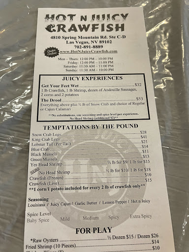 Food is delicious. Service is the worst. Eaten at this location 3 times. Once was okay. Last two have been complete crap. Henderson location is the best. Go there. Do not come here. 25 min to be seated. Thats fine, we expected this its a popular place. However the moment we sat down it began. I went to give my order and the girl answered questions of other people away from our table. She rushes through misses key things like which sauce. What kinda of fish ect. I have to get up and go to them to fix the orders as we knew is couldnt be right. So thats all well and done. Wrong. Completely different girl comes and says. "I need to retake your order she got none of it and needs it all again.. okay done... wrong again. Order starts coming out. Wrong food. We get food we didnt even order and missing one we did. "They will fix it so sry. We are busy and arent paying attention tonight" This girl was nice. Others could care less. Rest of the food comes. I ordered hot juicy sauce mild wife ordered garlic butter on her crab. Both sauces EXACTLY THE SAME. No crackers. I go up... because its fast food now you service yourself less its time for them to hand you a bill. Tell the now guy at the counter. He tells me no. It looks that way. It tastes completely different. Go back. NOPE its juicy sauce. Even has the paste in the bottom and is super spicy. The guy comes... no crab crackers. Argues with me that its garlic butter. I pour the stuff out on my glove and say which is wrong then? They cant both be exactly the same and be two different sauces. He continued to argue with me then says fine we will just take it back. At this point Im not eating anything new. I dont need spit from some guy who wants to argue what everyone else there could plainly see. 10 mins later dinner about done crab crackers come.... great. Get drink refills. Which came but hardly which is odd since they are busy now. They just decided that counting drawers was more important than waiting tables. Which were completely covered in bags of trash. Not just ours. They literally left all dirty napkins cups trash anything you used on the table piled up until you are completely done then take some of it away so they have room for the bill. I will never come here again. $115 bill I gave them a $10 tip. Only reason I did so is I think they chop it and the couple of people who worked the other tables and didnt act like they worked at a walmart shouldnt be screwed for them. Id imagine these people take half of what they earn. I normally give 20% or more. I wanted to give $0 but I couldnt bring my self to do it. As I was paying the first girl attempted to say she was sorry for the way the night went and the crab mistake. I told her its over, no sense in saying sorry now when your employee wants to argue across the restaurant with me during my meal. GO TO THE HENDERSON LOCATION. ITS WORTH THE DRIVE. 1000% better service. If youre carrying out the food here is the same. The service here is awful.