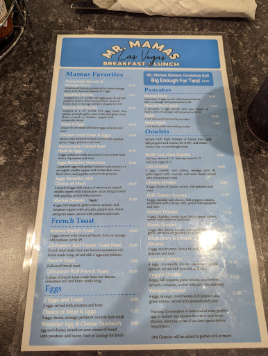 From Southeast FL, (MIA, FLL), a place that spoiled me in terms of it being nearly impossible to find a bad restaurant, living across the river from Louisville (know before you eat) the last 5 years, i worked for all but 4 months of 2015 in Vegas. A block from where i stay mr. Mammas opened, moving from some other part of vegas to near spring valley. At the time i remember them empty all the time. I went every morning once i ventured in. A year and a half and im back. I walked in and saw a signup sheet and tgought..uh oh...bet they have new prices to go with that. Nope. Same excellent food, same generous portions, same reasonable prices, and same friendly service despite that i was a single customer taking an entire table during their busy hour. Mr. Mammas is my breakfast place in Las Vegas.