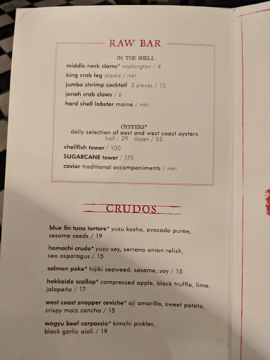 Sugarcane Review Welcome Aboard Sugarcane! Had light bites and cocktails with friends this week at Sugarcane! Wow, Very Impressed! As you enter the venue you walk into a very social gathering location are welcomed by a beautiful bar that has the “Raw Bar” right next to it! Very upscale cozy couches and tables await you there as well. The main dining room is located where you are able to view the kitchen, almost like everyone has a “Chef’s Table”, very nicely done. You can smell the aroma of incredible food being prepared! William was there to offer a tour, and I fell in love with their private dining room! If you are looking to host an event, prime location, with that upscale feel, you want to go to SugarCane!