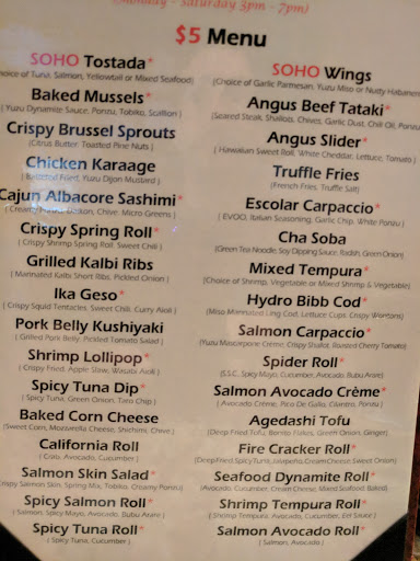 Soho is a wonderful little restaurant with an inviting staff and pleasant atmosphere. I found the food to be distinctively fresh with exciting flavors. Everything from the salmon avacado creme to the firecracker roll, crispy brussel sprouts to the green tea cheesecake was beautifully plated and even better eaten. No all you can eat option here, but the prices are more than fair, and definitely worth it. Thanks for a great dining experience.